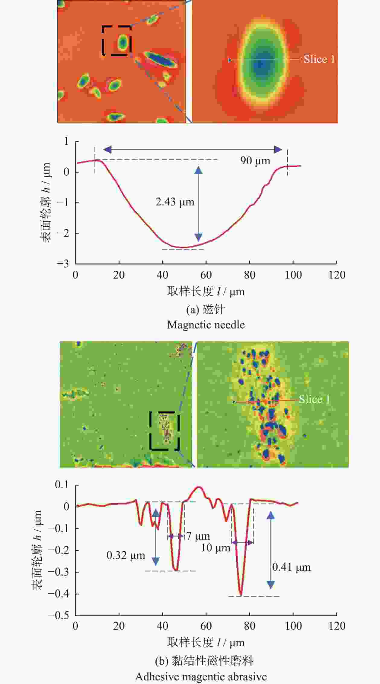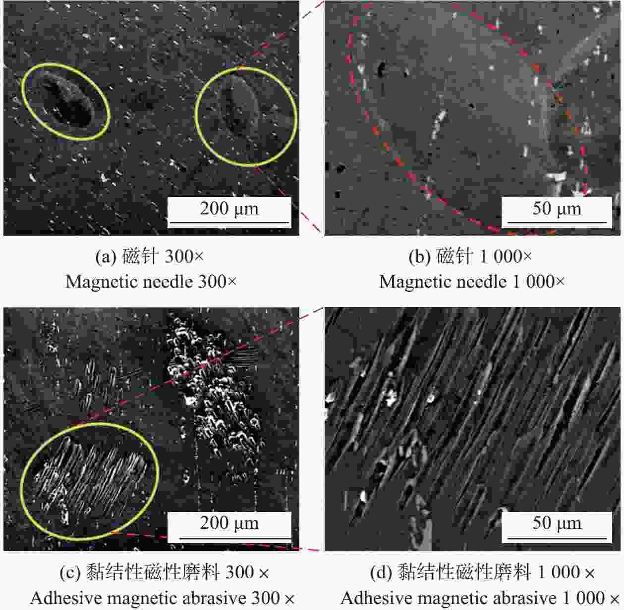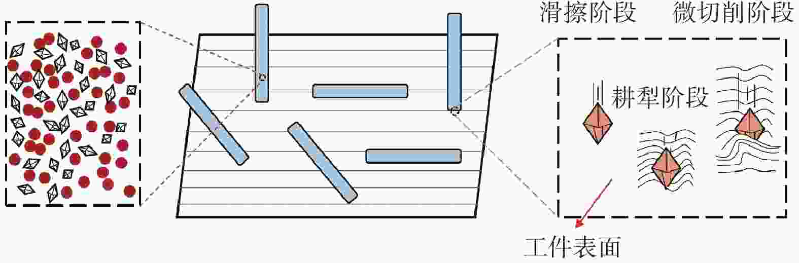Objectives With the increasing demand for parts with complex shapes and fine structures in high-end equipment, the requirements for finishing precision and surface quality are becoming more stringent. Magnetic polishing technology relies on magnetic fields to drive magnetic abrasives to move relative to the parts, allowing for simultaneous polishing of multiple complex parts. It is an effective method for achieving high-quality and efficient finishing of parts with complex shapes and fine structures. Magnetic abrasives serve as the "cutting tools" in magnetic polishing, and their preparation is a key technology in this process. Magnetic abrasives prepared by sintering, bonding, and atomization methods possess good polishing effects, however, they need be crushed into powdery particles for use, which causes inconvenience in magnetic polishing. Research on the preparation of magnetic abrasives is therefore indispensable to meet the demands of high-performance polishing. Methods To enhance the performance of magnetic polishing, a slender bonded magnetic abrasive is designed, where carbonyl iron powders are adopted as the magnetic phase and silicon carbide are adopted as the abrasive phase. The two-phase materials are bonded with resin chemicals, and bonding strength is enhanced through chemical modification using a coupling agent. The movement patterns and material removal mechanisms of the prepared magnetic abrasives are analyzed to explore their differences from conventional stainless-steel magnetic needles. The differences in scratch behavior at the micro level are experimentally studied using aluminum alloy samples, and the impact on polishing quality is studied. Preparation of magnetic polishing abrasives: First, carbonyl or silicon carbide powders are separately added into a 0.1 g/mL dilute NaOH solution in a beaker, fully submerged, and stirred at constant temperature, then washed with anhydrous ethanol until neutral and dried. Second, the treated carbonyl iron powders or silicon carbide powders are placed in a beaker, a silane coupling agent KH-560 is added, and the mixture is processed in a water bath to obtain dried powders. Third, the above-modified carbonyl iron powders and silicon carbide powders are weighed and mixed in a predetermined mass ratio, and stirred for 6 hours to solve the problem of uneven powder agglomeration. Finally, a predetermined ratio of epoxy resin is added to the mixed inorganic powders, and slender magnetic abrasives with a diameter of 2-3 mm and a length of 6-8 mm are obtained through extrusion molding, followed by a 24 h curing treatment at room temperature. Results A study is conducted on the material removal effect of magnetic abrasives. The polishing effects of workpiece surfaces using magnetic needles and magnetic abrasives are compared. The elasticity of the bonded magnetic abrasives is significantly higher than that of magnetic needles, resulting in a weaker impact on workpieces, with polishing mainly achieved by the embedded silicon carbide abrasives. To facilitate observation of scratches in magnetic polishing, 6061 aluminum alloy workpieces with an initial surface roughness of Sa 4 nm are adopted for magnetic polishing experiments, for exploration of differences in polishing between magnetic needles and elastic magnetic abrasives. With magnetic needles, the surface texture caused by the superposition of pits formed by needle impact tends to stablilize after 30 min of polishing, achieving a surface roughness of Sa 1.418 μm. With magnetic abrasives, the surface texture caused by abrasive scratches tends to stabilize after 20 min of polishing, achieving a surface roughness of Sa 0.318 μm.Conclusions A preparation method is proposed for the fabrication of slender, elastic magnetic abrasives. Material removal mechanisms and surface morphology formation are analyzed, and experiments on 6061 aluminum alloy workpieces are carried out to compare conventional magnetic needles with the slender magnetic abrasives. The results show that elastic magnetic abrasives possess higher polishing efficiency and achieve better polishing effects than magnetic needles for metal materials such as 6061 aluminum alloy. -