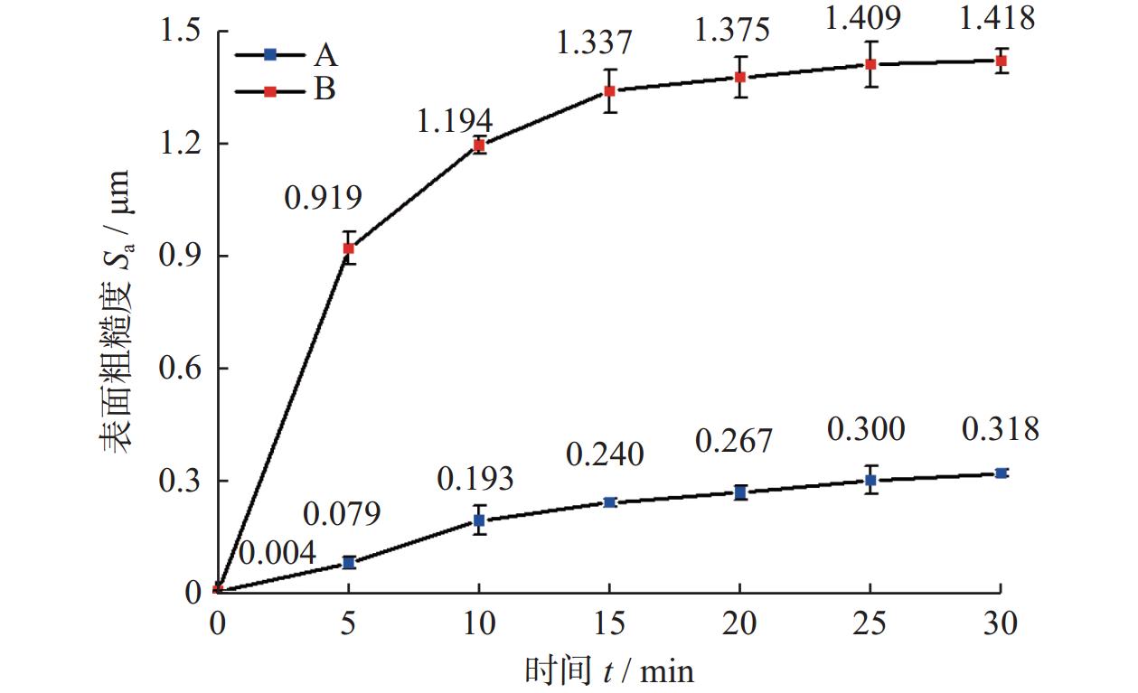 标号 磨料规格 电机频率 f / Hz 抛光时间 t / s A W14 20 30 B ϕ 1.2 mm × 8 mm 20 30 表 3 时间单因素实验加工参数